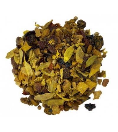 DESC: Apple bits, rosehip peels, grapes, ginger, cinnamon, pumpkin bits (5 %), coriander, flavour, cardamom fruits, cloves, black pepper, cardamom fruit husk, curcuma, sunflower petals